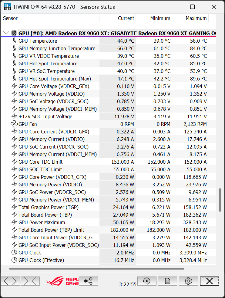 During gaming, the GPU temperature tops out around 58°C, and the memory junction sits at about 84°C. Even under heavier synthetic loads, the temperatures are still under control, peaking at 61.5°C for the GPU.