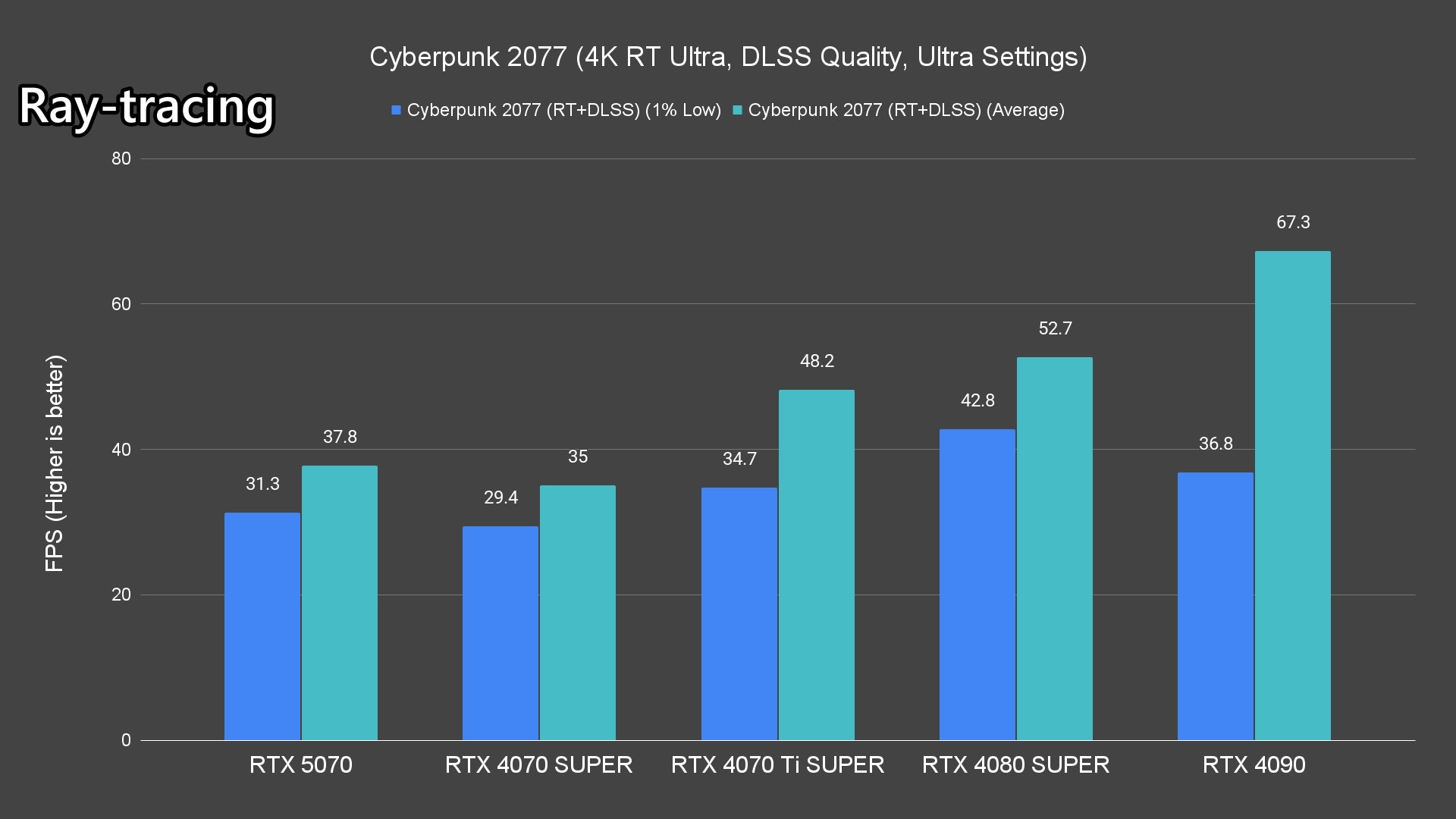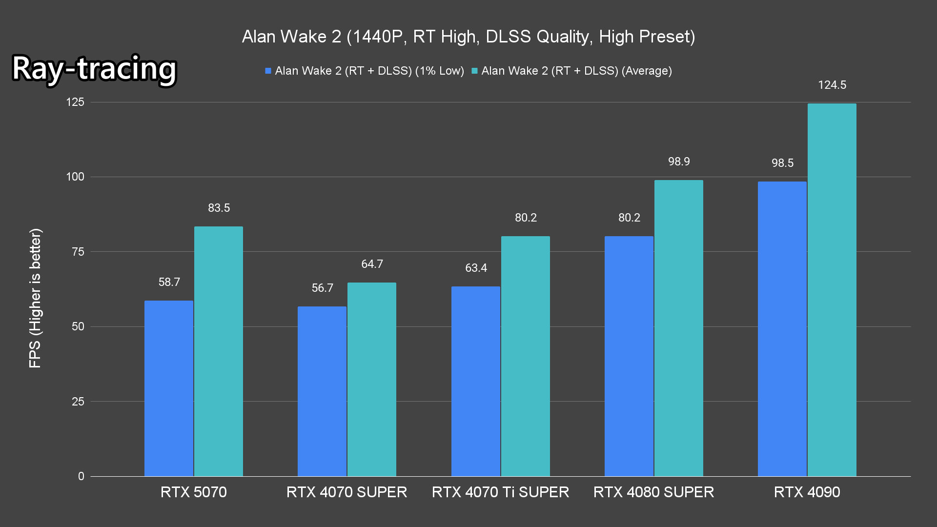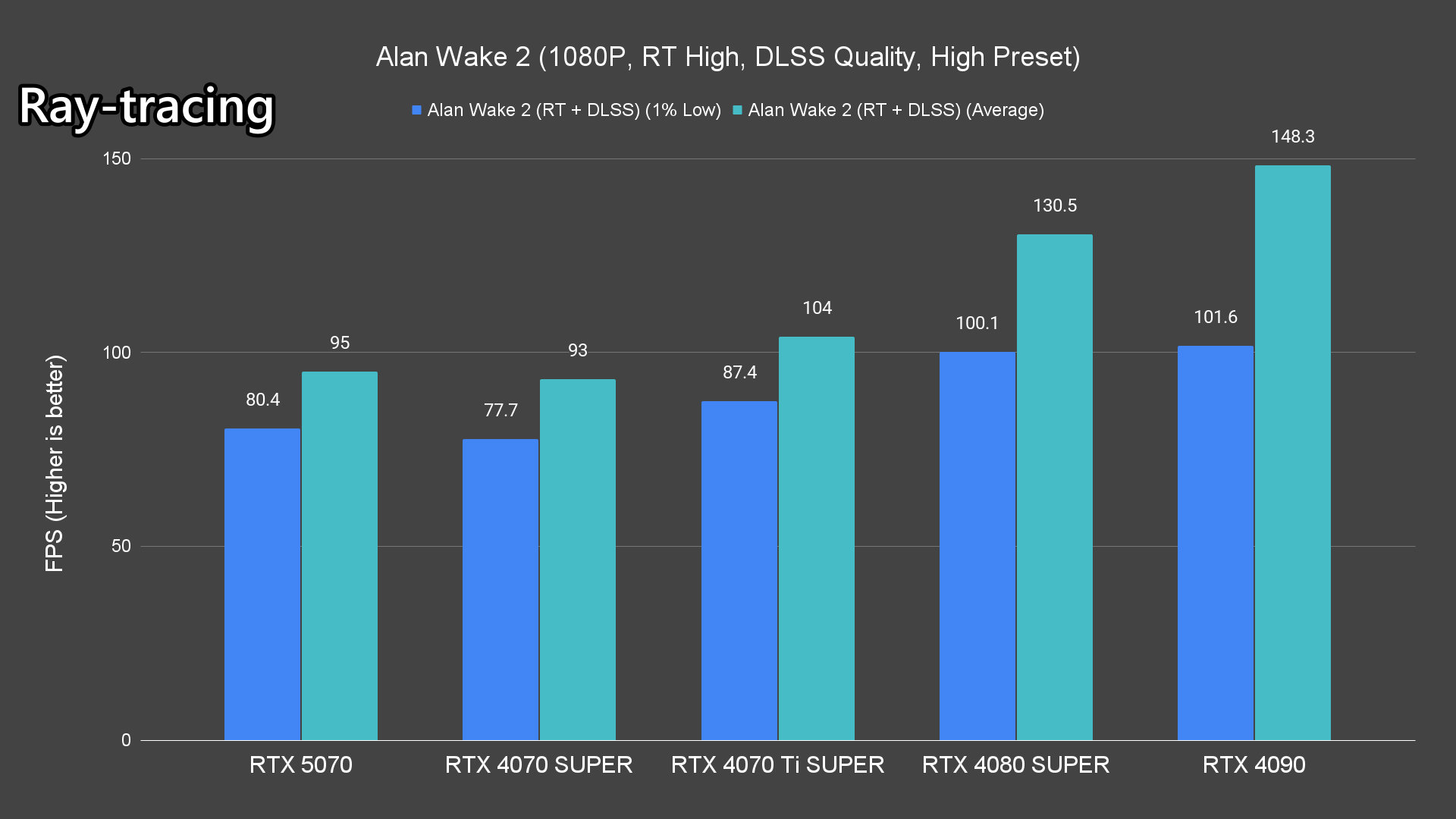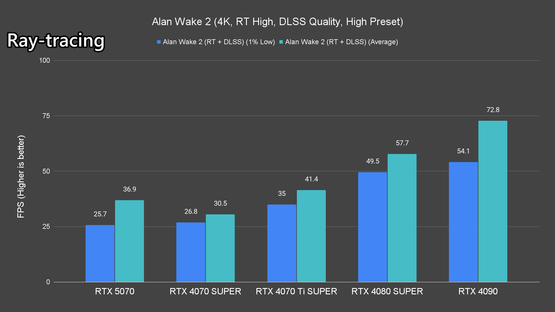 Moving on to the ray-tracing performance, a similar pattern emerges once again. The RTX 5070 performs very well in most titles, averaging over 60FPS except for Alan Wake 2 and Cyberpunk 2077 which pushed the card to its limits.