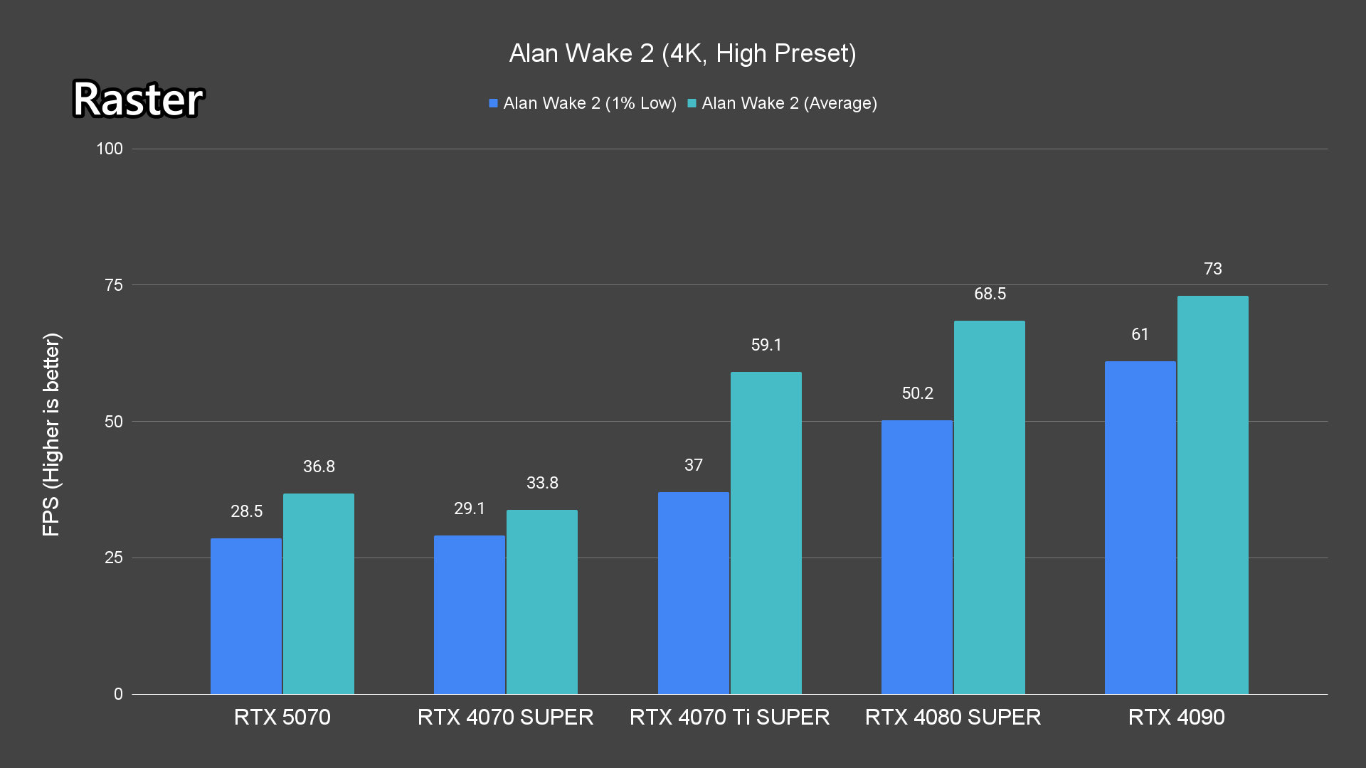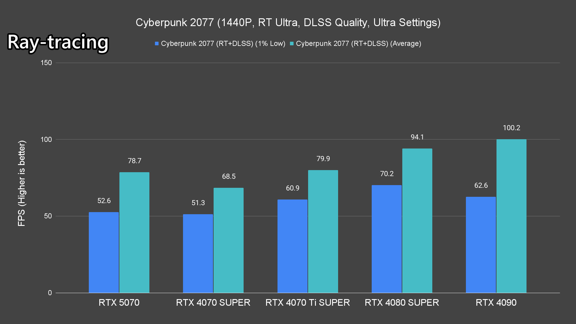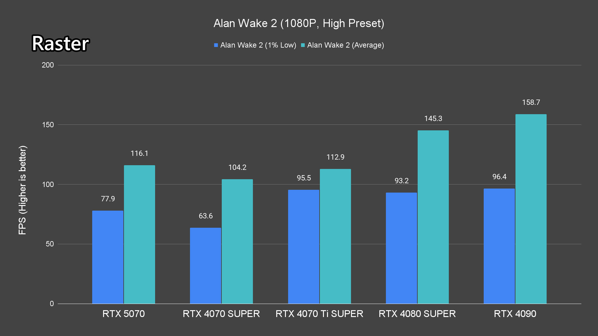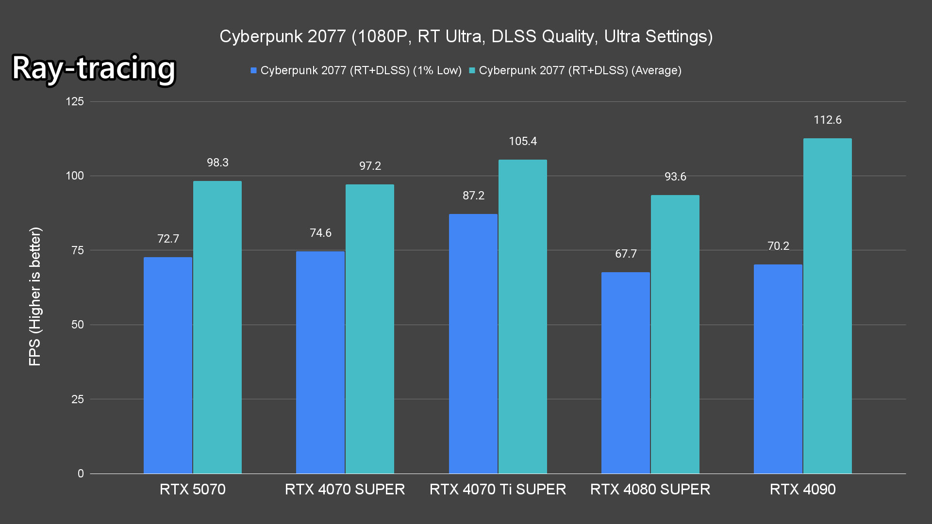 Moving on to the ray-tracing performance, a similar pattern emerges once again. The RTX 5070 performs very well in most titles, averaging over 60FPS except for Alan Wake 2 and Cyberpunk 2077 which pushed the card to its limits.