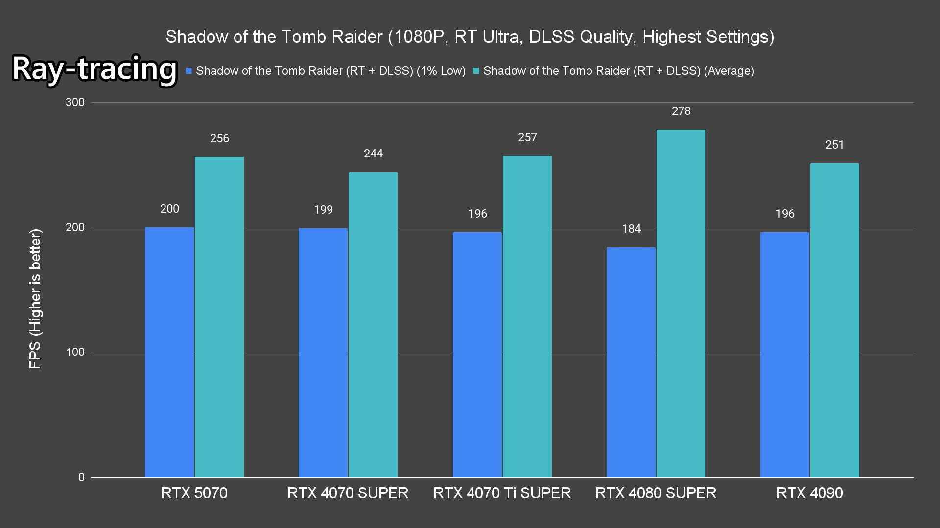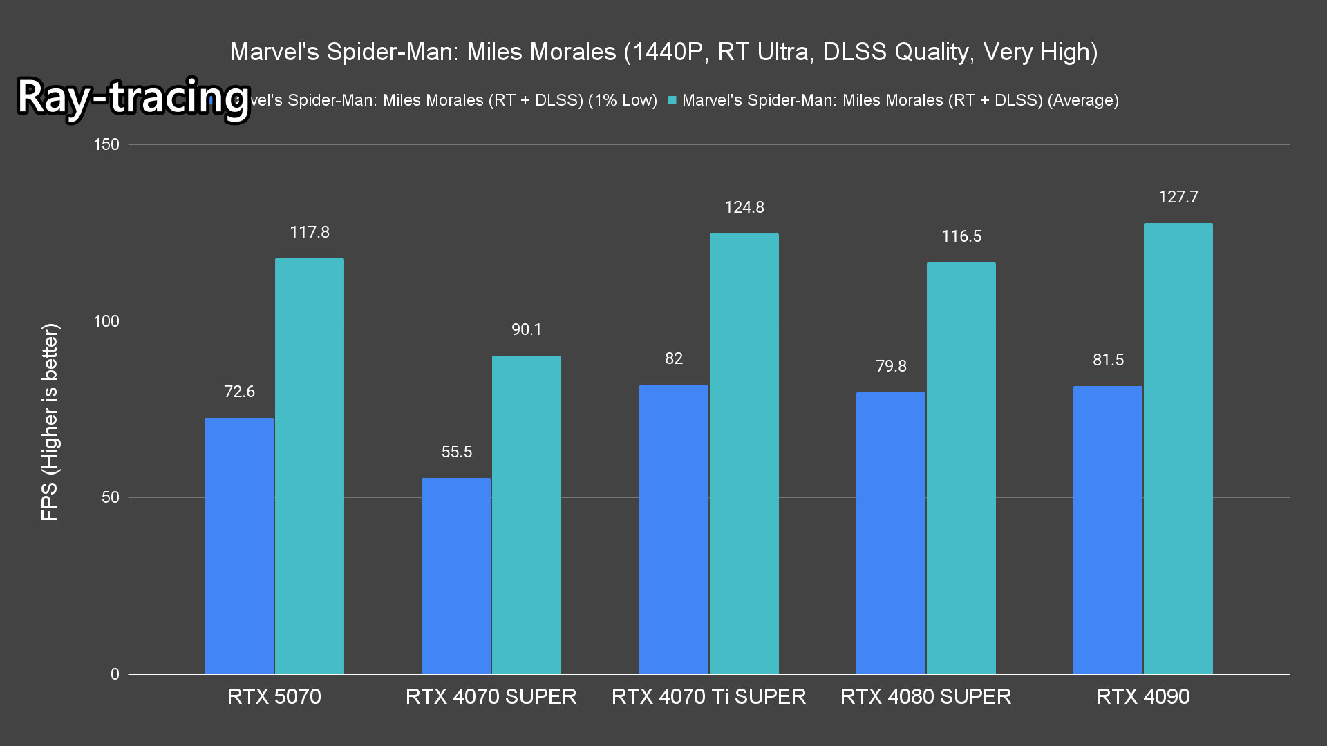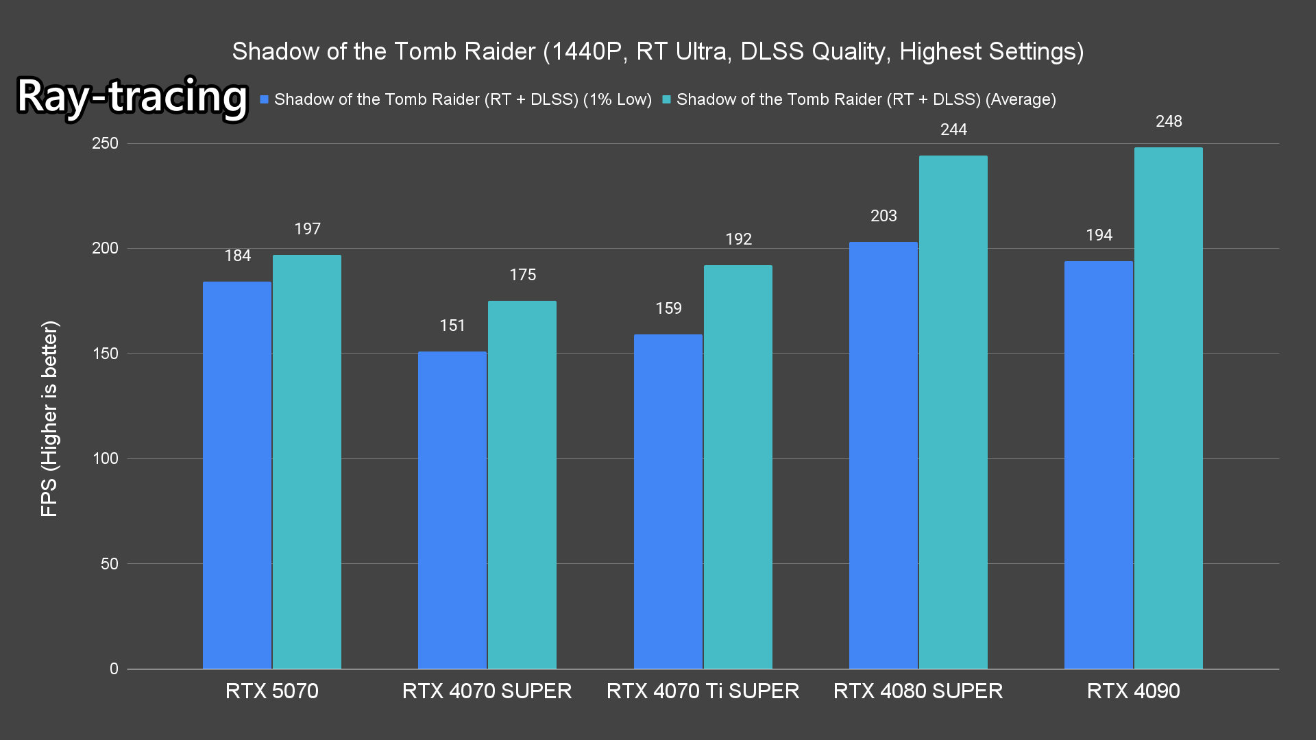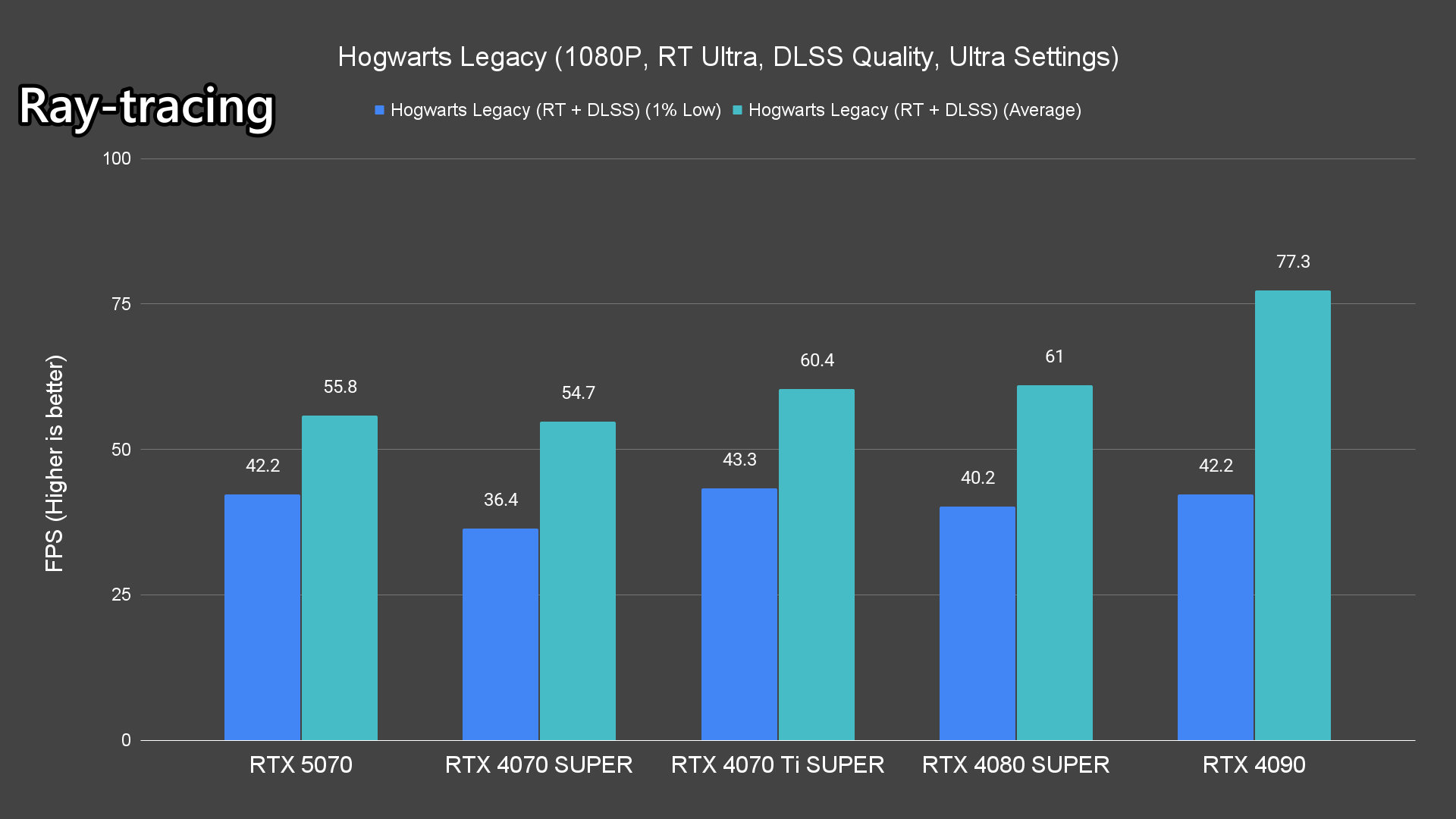 Moving on to the ray-tracing performance, a similar pattern emerges once again. The RTX 5070 performs very well in most titles, averaging over 60FPS except for Alan Wake 2 and Cyberpunk 2077 which pushed the card to its limits.