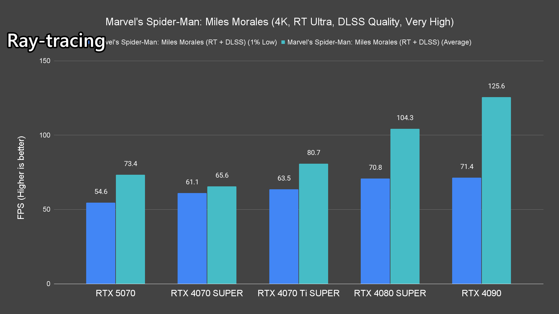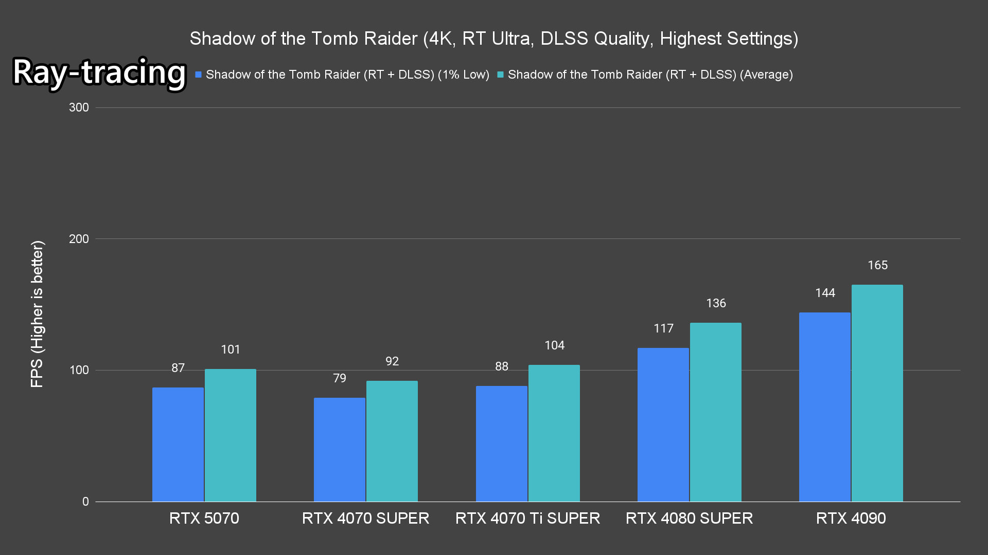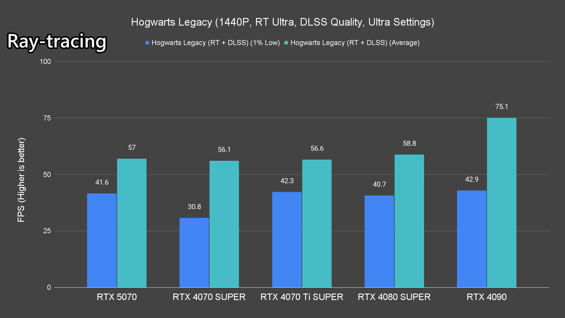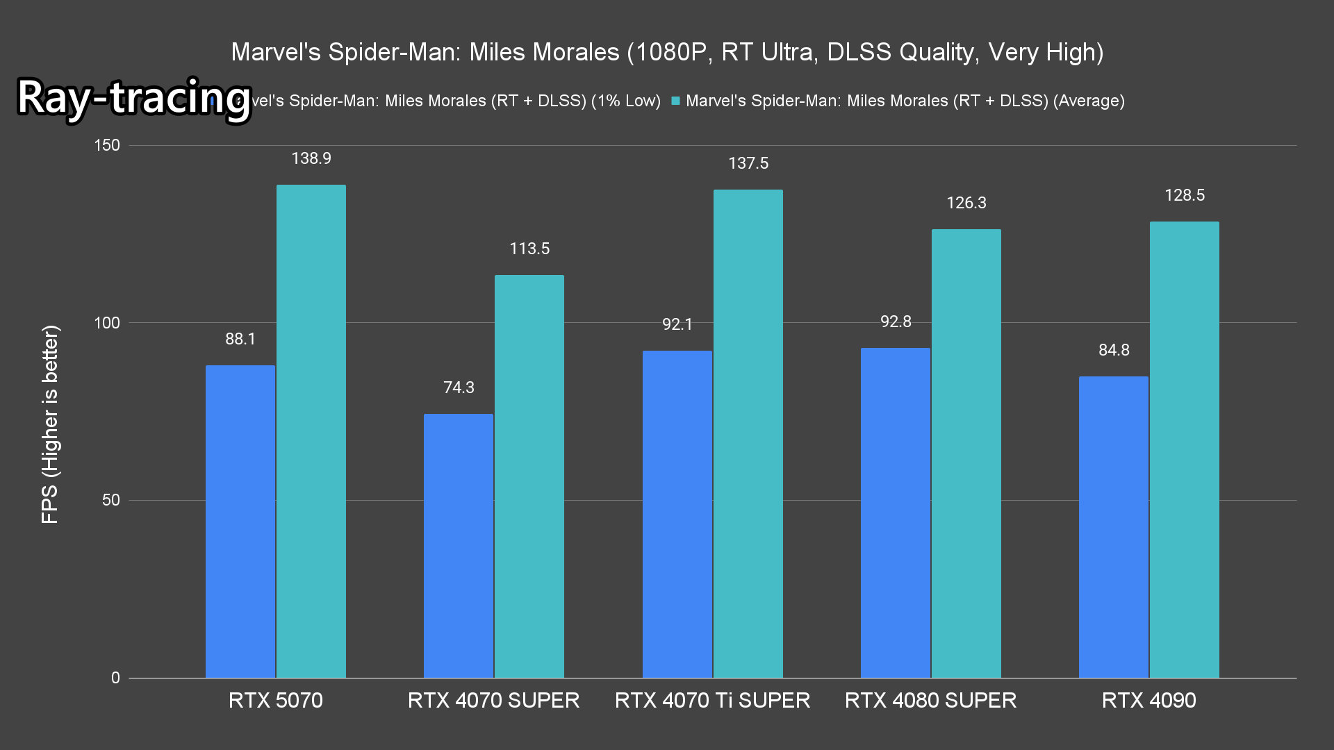 Moving on to the ray-tracing performance, a similar pattern emerges once again. The RTX 5070 performs very well in most titles, averaging over 60FPS except for Alan Wake 2 and Cyberpunk 2077 which pushed the card to its limits.