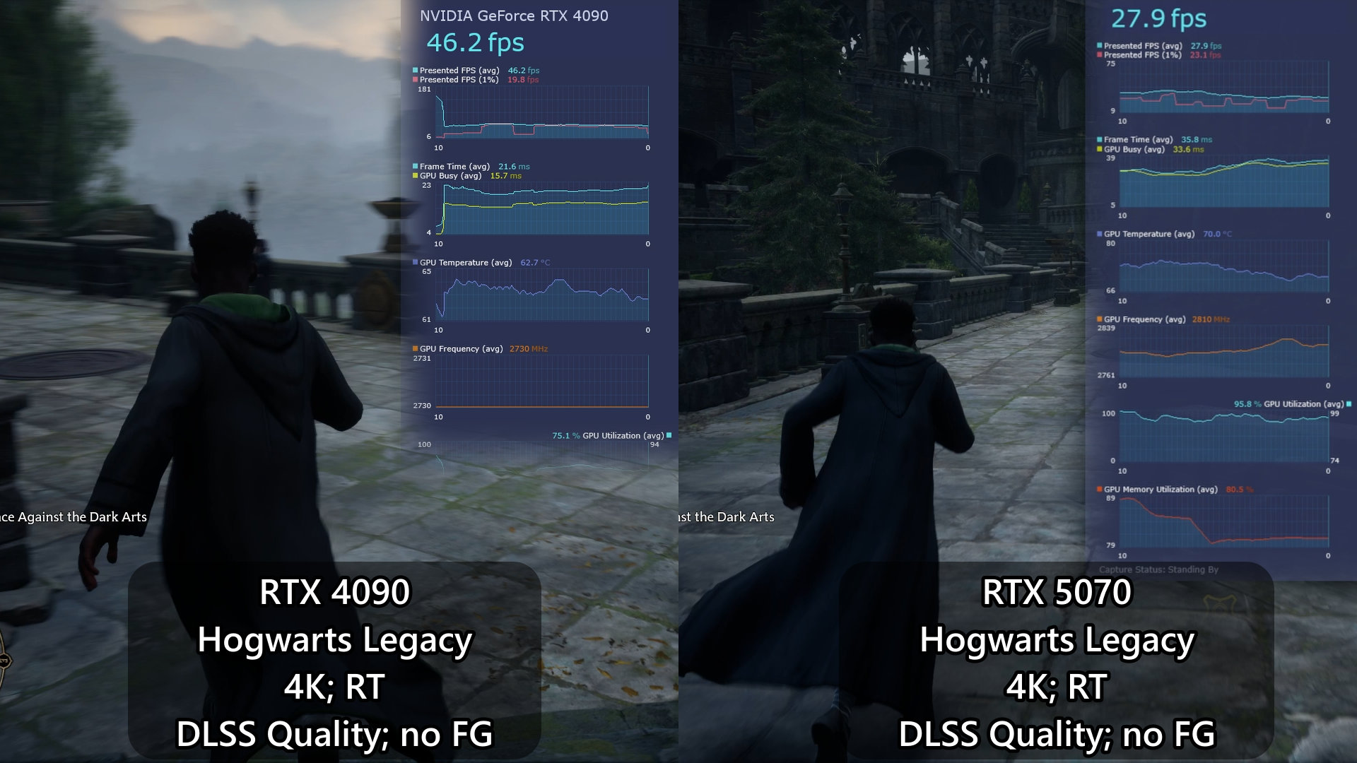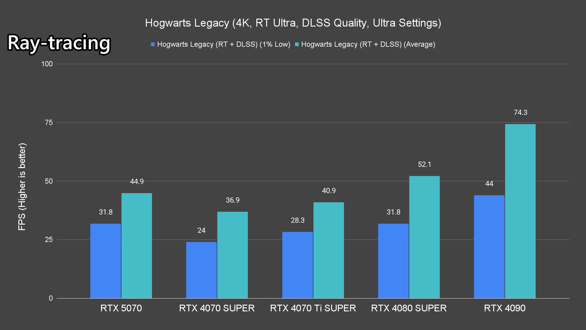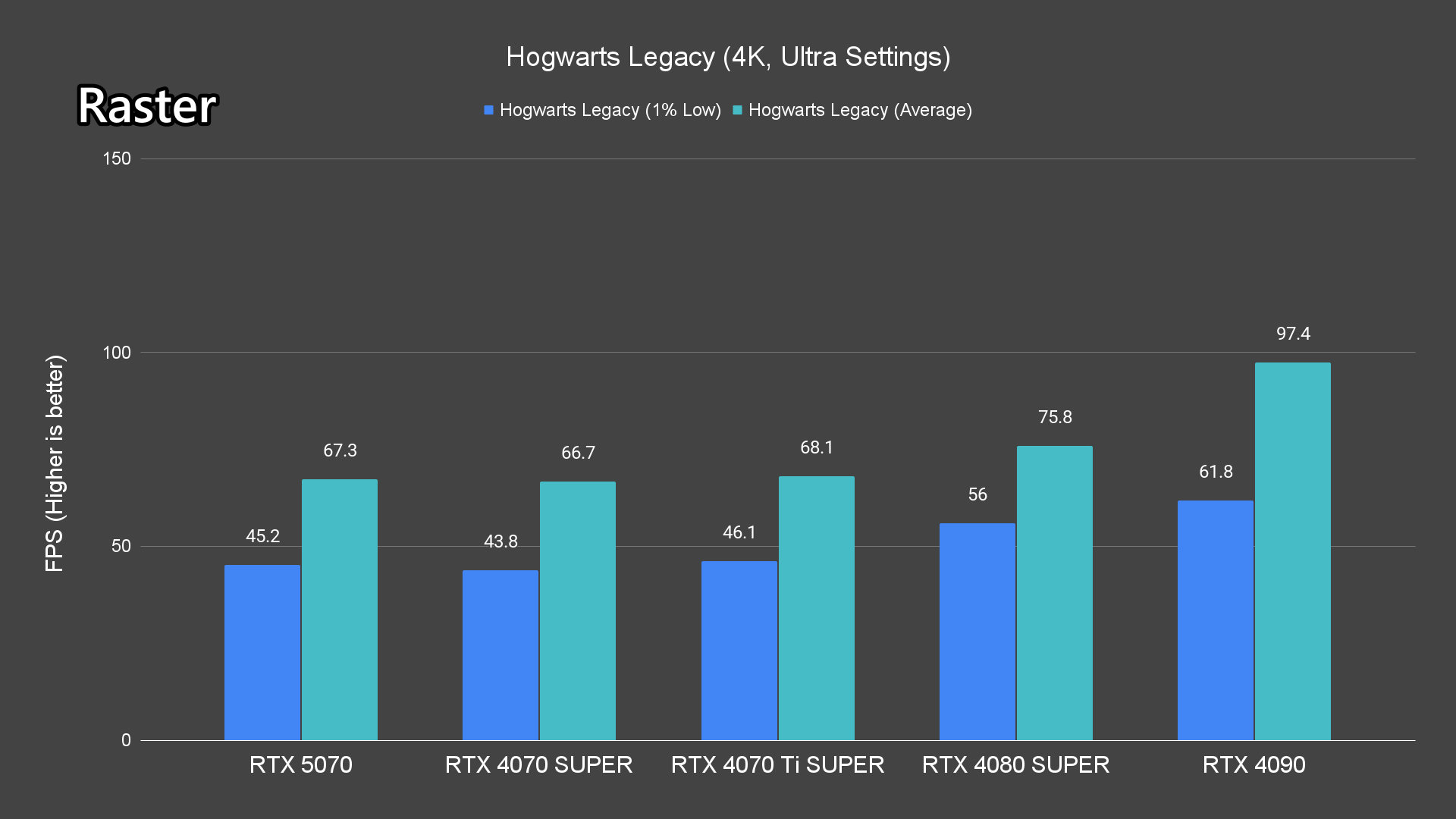 Starting with the raster performance – even though the RTX 5070 is marketed for 1440p gaming, it is surprisingly capable for 4K gaming too. It can maintain over 60FPS in most titles except for Alan Wake 2 and Cyberpunk 2077, which are known to be extremely demanding. Surprisingly though, Hogwarts Legacy can run over 60fps.