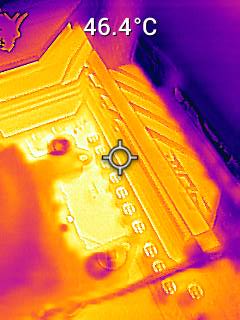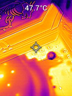 Moving on to our thermal imaging camera provided further insight, revealing the VRM heatsink maintained impressively low temperatures, barely exceeding 50°C throughout the stress test. This indicates efficient VRM cooling. Overall, the motherboard exhibited stable thermal performance even during extended periods of heavy use, and no major problems were observed in other benchmarks.