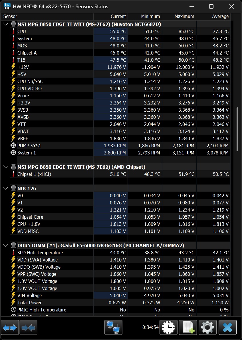 Putting the MPG B850 EDGE Ti WiFi to the test, we paired it with an AMD Ryzen 9 9900X. The CPU registered a power draw of approximately 150-160W, which the motherboard’s robust VRM design effectively managed, highlighting its suitability for high-end processors.