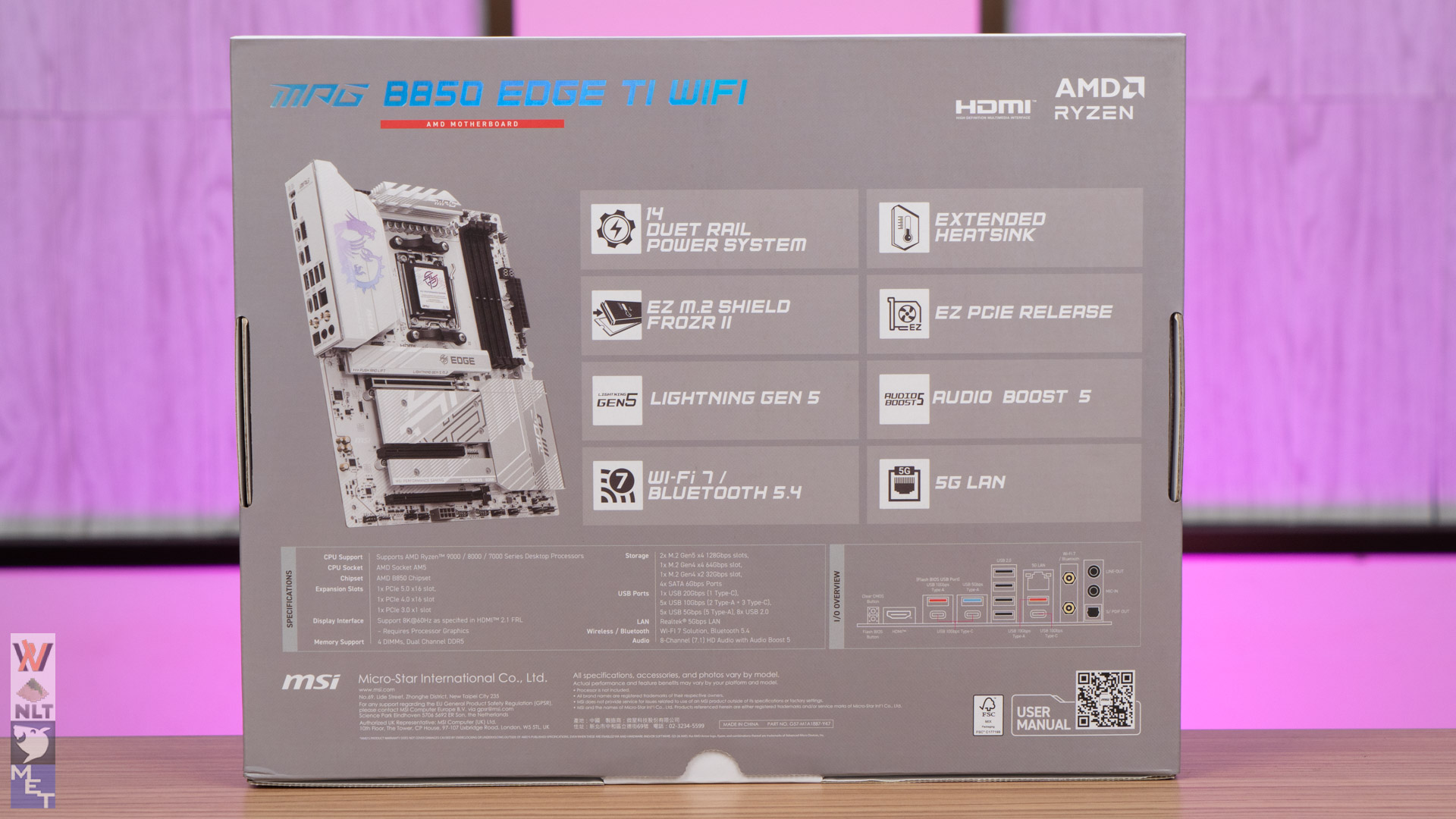 Out of the box, the MPG B850 EDGE Ti WiFi immediately gives off vibes similar to the Carbon WiFi series, positioning itself a notch above the B850 Tomahawk and Mortar WiFi in terms of premium features. A quick glance at the back of the packaging reveals some standout highlights like Wi-Fi 7 support, EZ PCIe Release, and EZ M.2 Shield — features typically reserved for higher-tier boards.