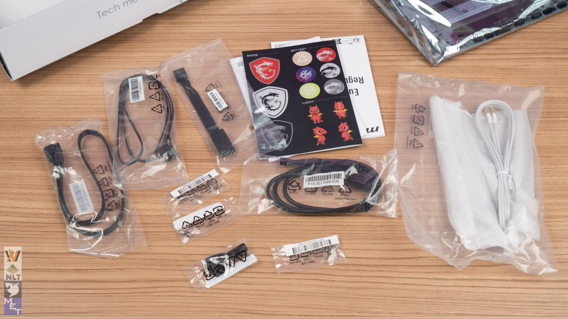 Included in the box are a SATA cable, EZ M.2 clip II remover, EZ M.2 clip II, EZ Wi-Fi antenna, 1-to-3 EZ Conn-Cable V2, EZ Front panel cable, ARGB extension cable, the standard paper documents, and a sheet of cable stickers.