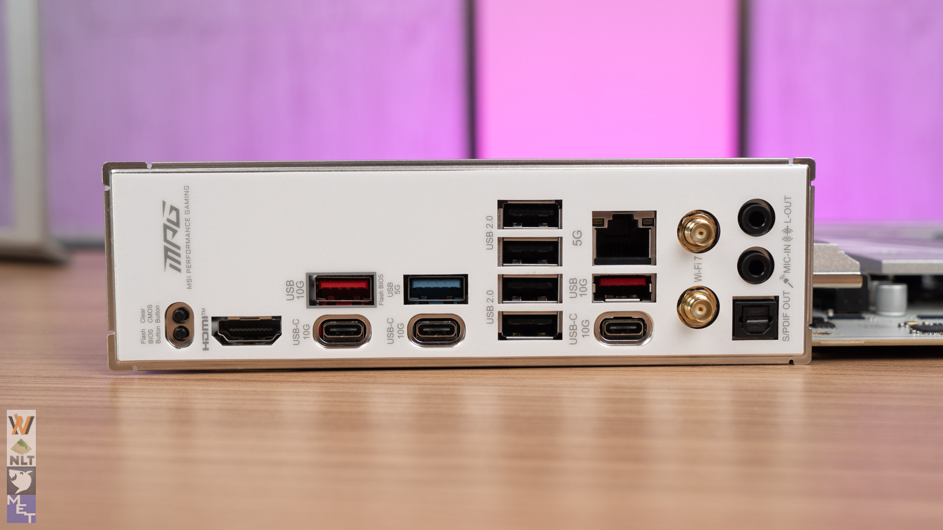 The pre-installed I/O shield is always a welcome touch, and MSI’s BIOS is as user-friendly as ever, with an intuitive layout and all the tuning options you’d need. On the rear I/O, you’ll find a generous selection of USB ports, including a 20Gbps USB-C port, multiple USB-A, HDMI, and DisplayPort outputs (handy for troubleshooting or using APU), and the usual 3.5mm audio jacks powered by Realtek’s ALC4080 codec.