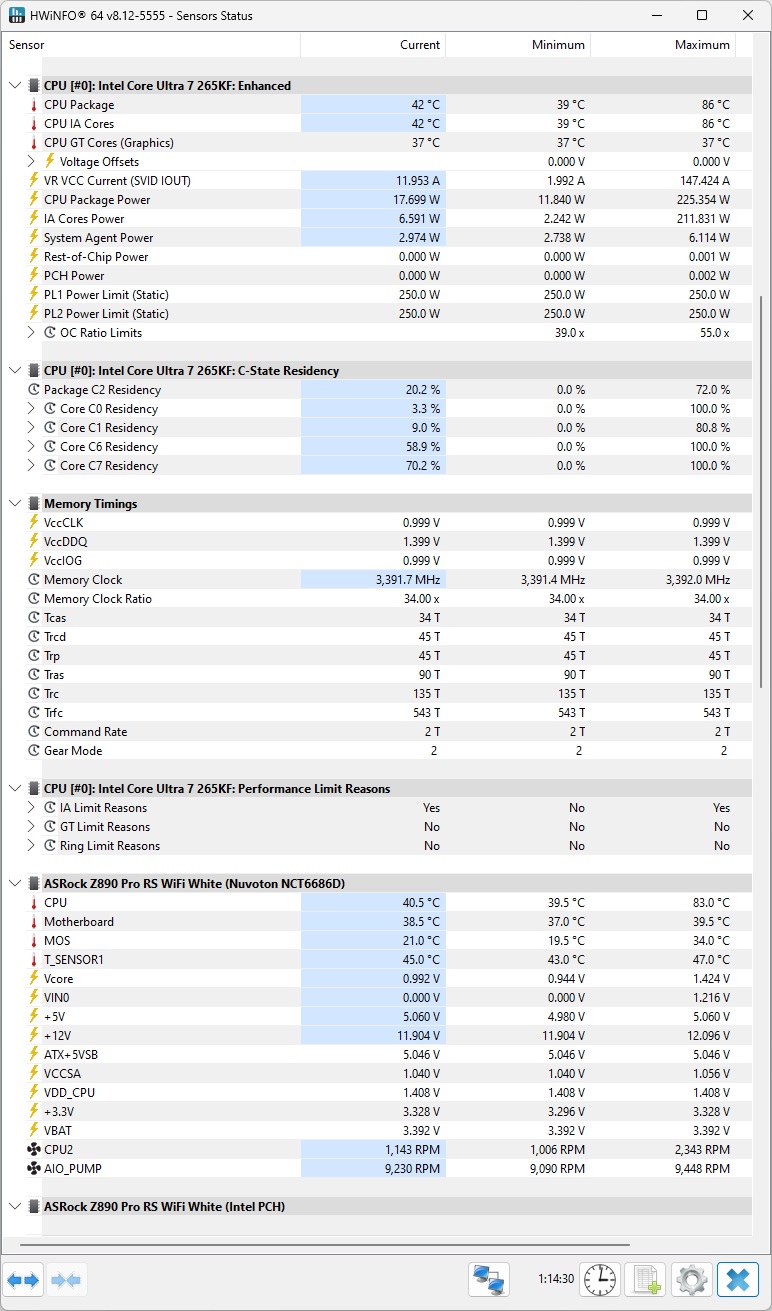 In this test, the ASRock Z890 Pro RS WiFi motherboard was paired with Intel’s Core Ultra 7 265KF, a flagship processor with a listed turbo power limit of 250W, similar to the Core Ultra 285K. During testing, the power consumption occasionally exceeded this limit by 10-30W with Intel’s default settings, yet the temperatures remained impressively stable, rarely surpassing 80°C, thanks to the efficient cooling from the Cooler Master MasterLiquid 360 ION.