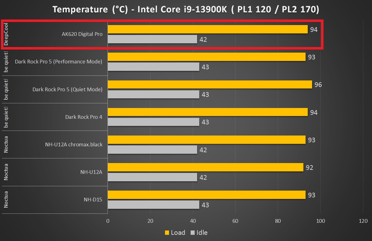 In our temperature comparison, the AK620 Digital Pro performed exceptionally well, competing closely with premium options like the be quiet! Dark Rock Pro 5 and Noctua NH-D15. Despite the demanding workload, the fan noise remained acceptable during stress tests and quickly became nearly inaudible afterward.