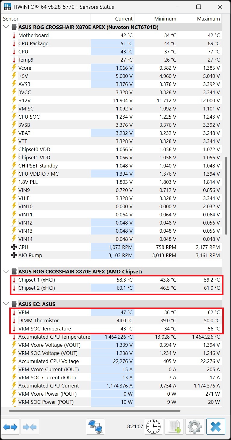On heavy CPU workloads, the VRM temperature peaked at 62°C according to HWInfo64. The chipset maintained a steady temperature of about 59-61°C throughout testing, showing that ASUS has done a solid job with heatsink design and airflow.