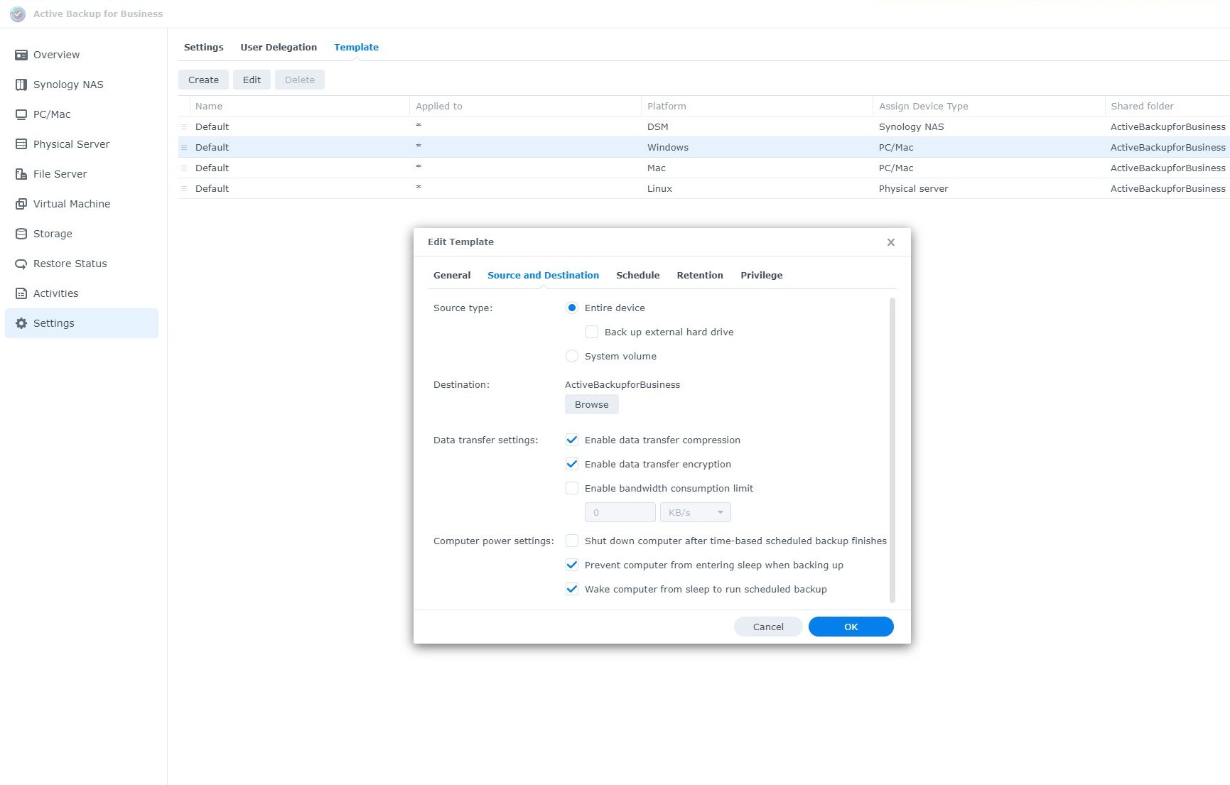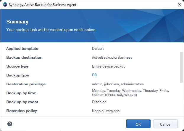As the agent only works as a backup client, it doesn’t do much other than fetching the instructions from the Synology server. The backup template is managed on the server as mentioned earlier.