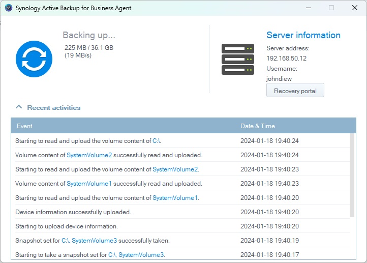 What you see is a simple user interface that shows the recent activity logs and a quick button to access the Recovery Portal which is also on the Synology Server.
