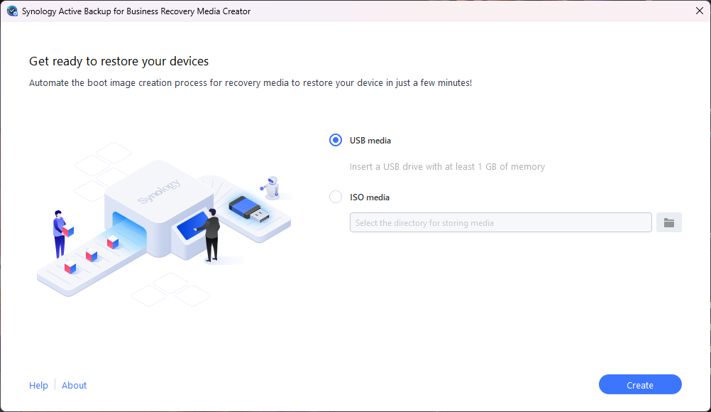 ABB also has a recovery media creator that allows you to create recovery media with the ABB Recovery Media Creator. You can use the recovery media to boot the device and restore it with the ABB Recovery Wizard.
