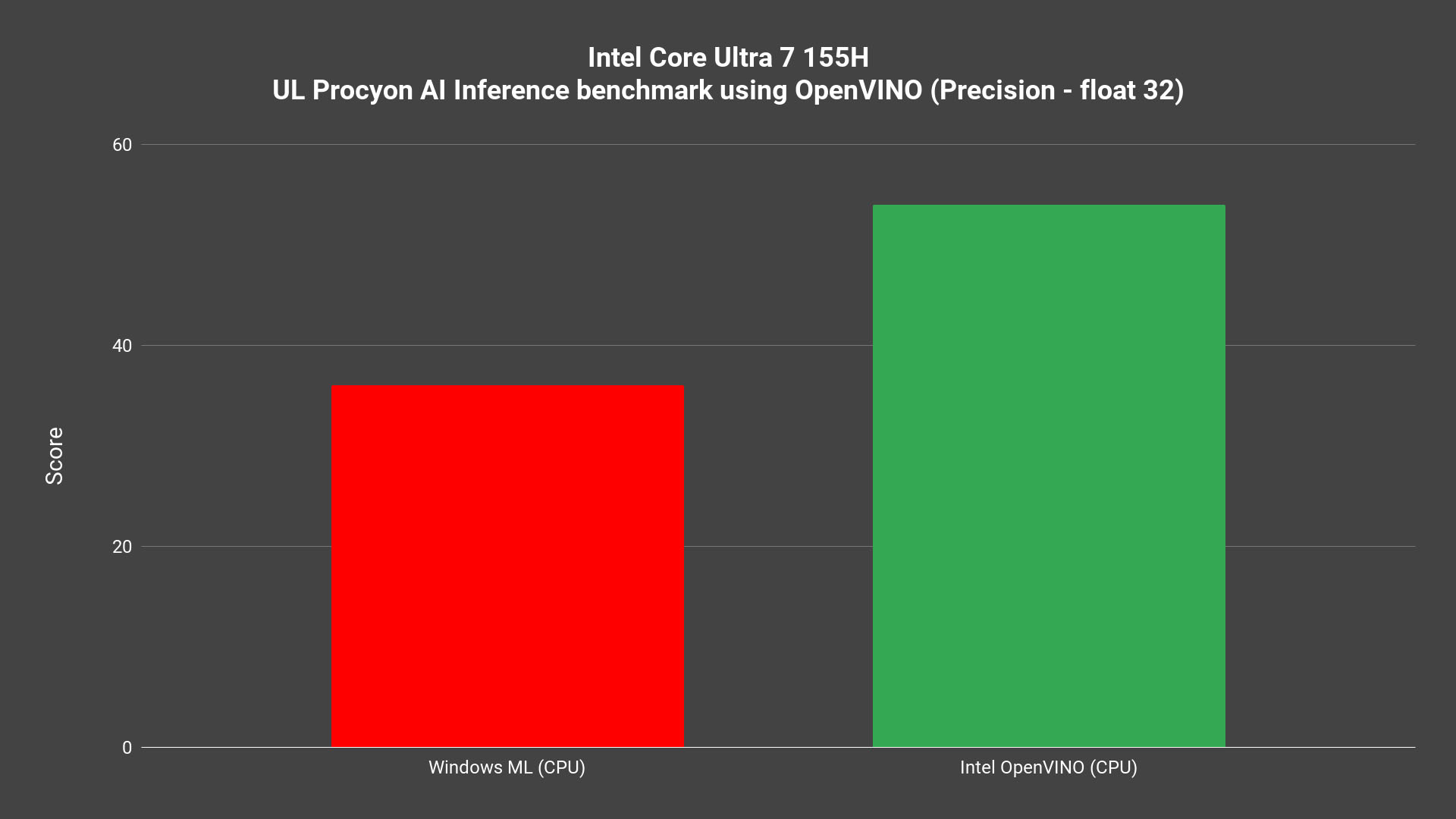 Okay, remember that the Meteor Lake SoCs have a built-in NPU? Yeah, unfortunately, we can’t use the NPU with Windows ML so we can’t compare the performance difference. As we can see here, the performance of the NPU is more than 4x better than the CPU using OpenVINO.
