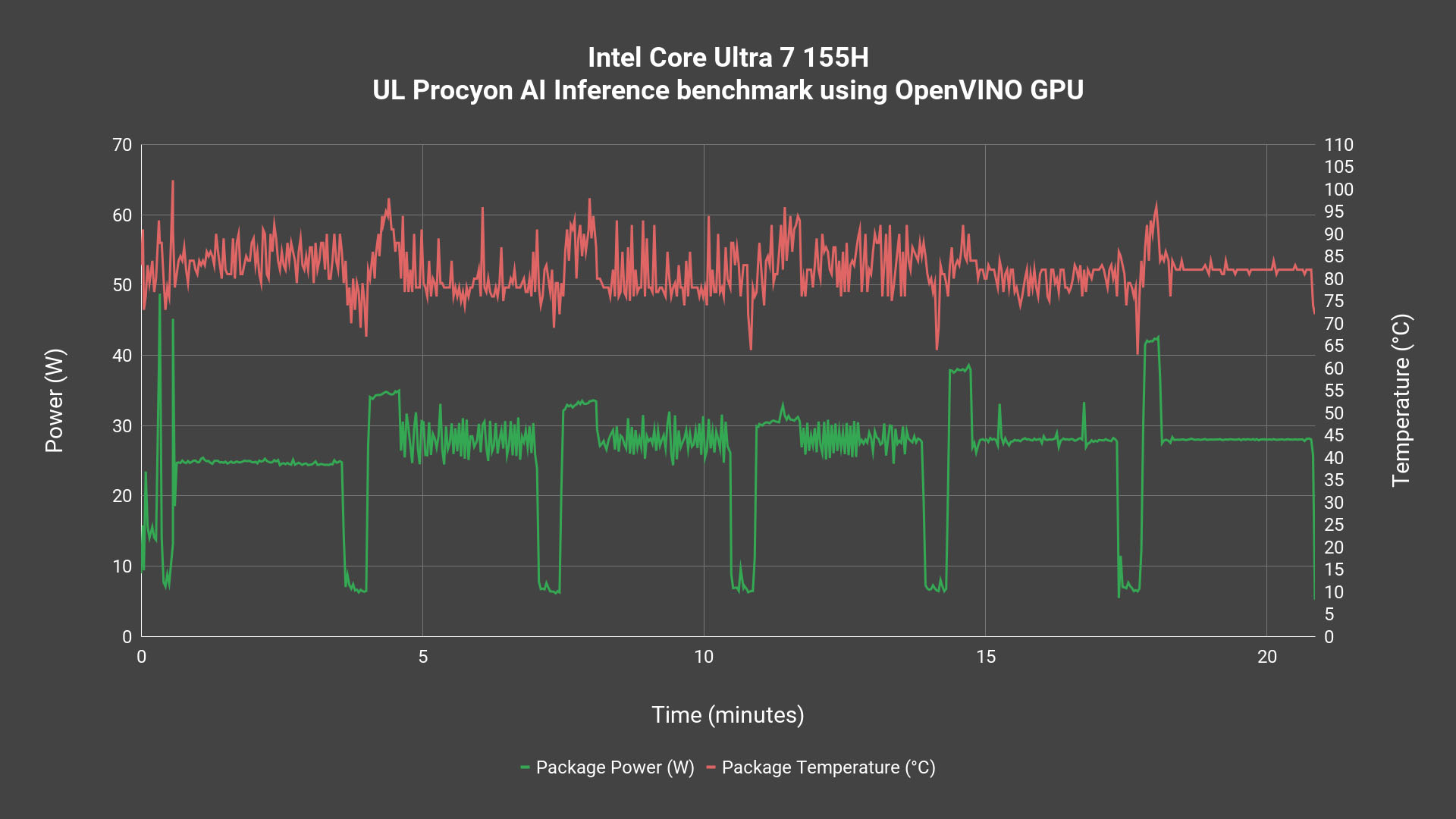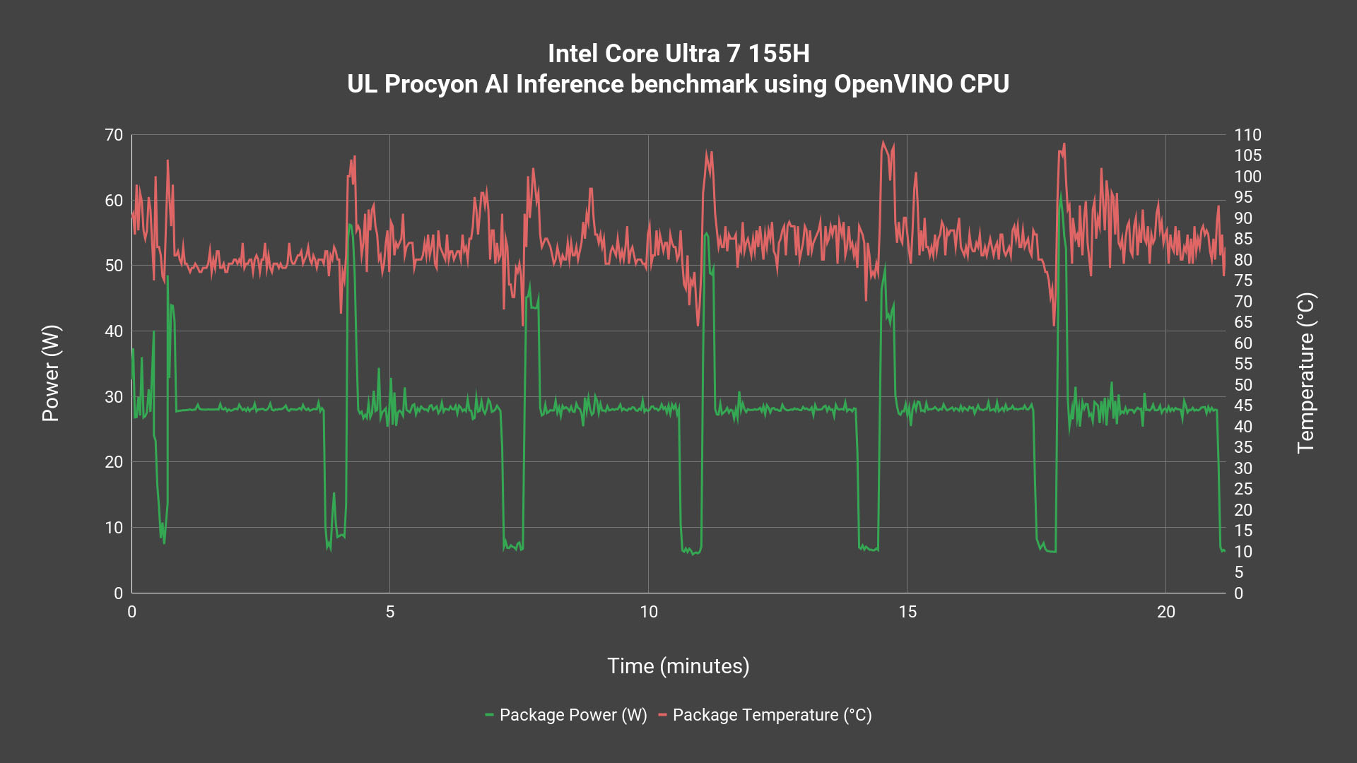 My next big concern is the power consumption. How do they vary? Is the NPU the perfect choice for both speed and power efficiency? I redid the tests using OpenVINO only and this is the graph that we got. Those dips are because the one test has ended and the next test is loading – and using the CPU, we can see both the power consumption and temperature have a lot of spikes, taking about 21 minutes to complete the benchmark.