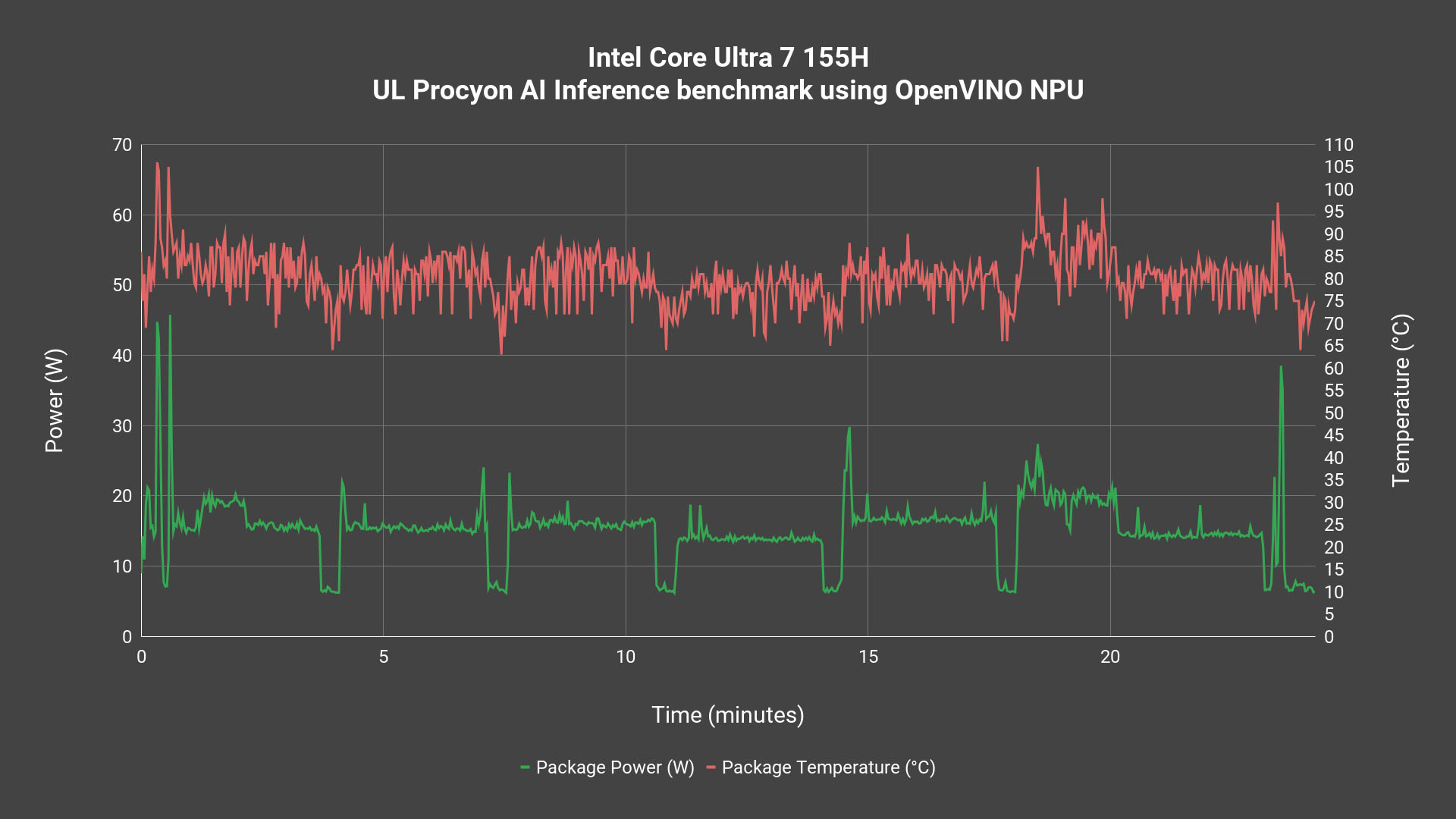 Now is time for the star of the show – the NPU. The power draw is significantly lower and the temperature seems to be lower too. However, it takes nearly 25 minutes to complete the benchmark.