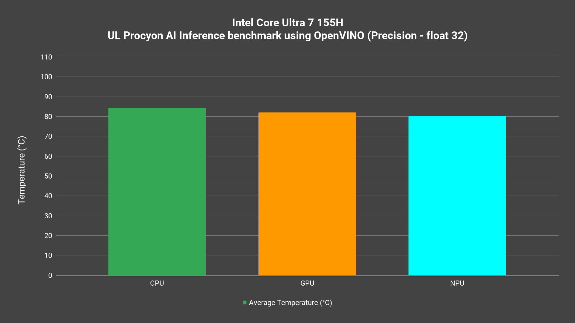 What about the average temperature then? Surprisingly, they’re all pretty close in terms of the average temperature. Once again, the NPU is the most efficient, then comes the GPU, and last is the CPU.