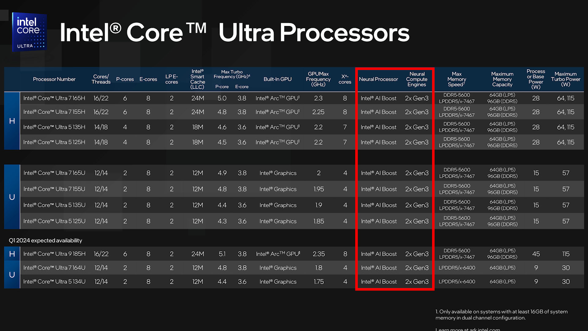 From the list of SKUs provided by Intel, it seems like every single SoC that is based on the Meteor Lake architecture have the same Intel AI Boost neural processor.