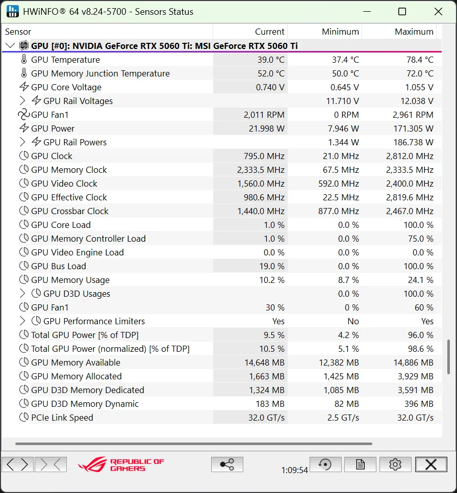 In productivity tasks like rendering and video editing, the RTX 5060 Ti draws around 200W, while gaming sees that number drop to about 170W. That’s pretty efficient for what you’re getting.