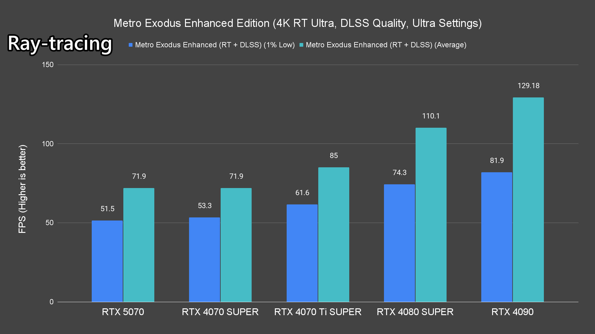 Moving on to the ray-tracing performance, a similar pattern emerges once again. The RTX 5070 performs very well in most titles, averaging over 60FPS except for Alan Wake 2 and Cyberpunk 2077 which pushed the card to its limits.