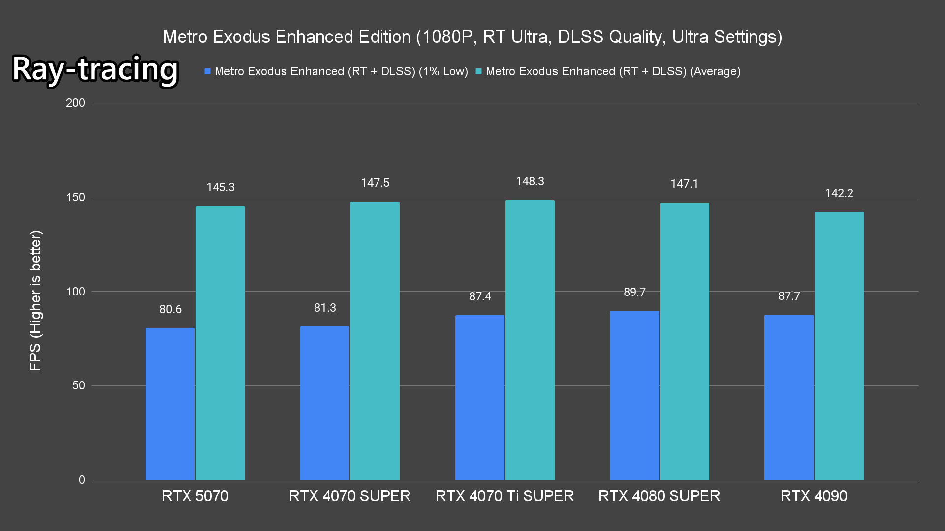 At 1440p, it will once again match or outperform the RTX 4070 Ti SUPER, except in Metro Exodus. Compared to the RTX 4070 SUPER though, the gap is more pronounced.