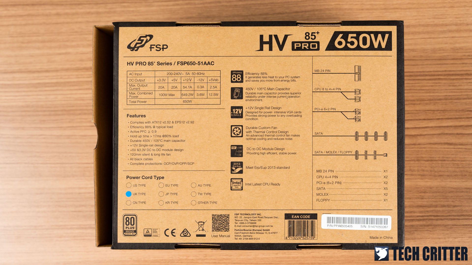 Compared to the 80 PLUS Gold or higher rated models, FSP kept the packaging for its HV PRO 85+ series simple, really simple. You get an environmentally friendly box without fancy colors, but the crucial information such as the output, features, and connectors available can still be found around the box without being amiss.