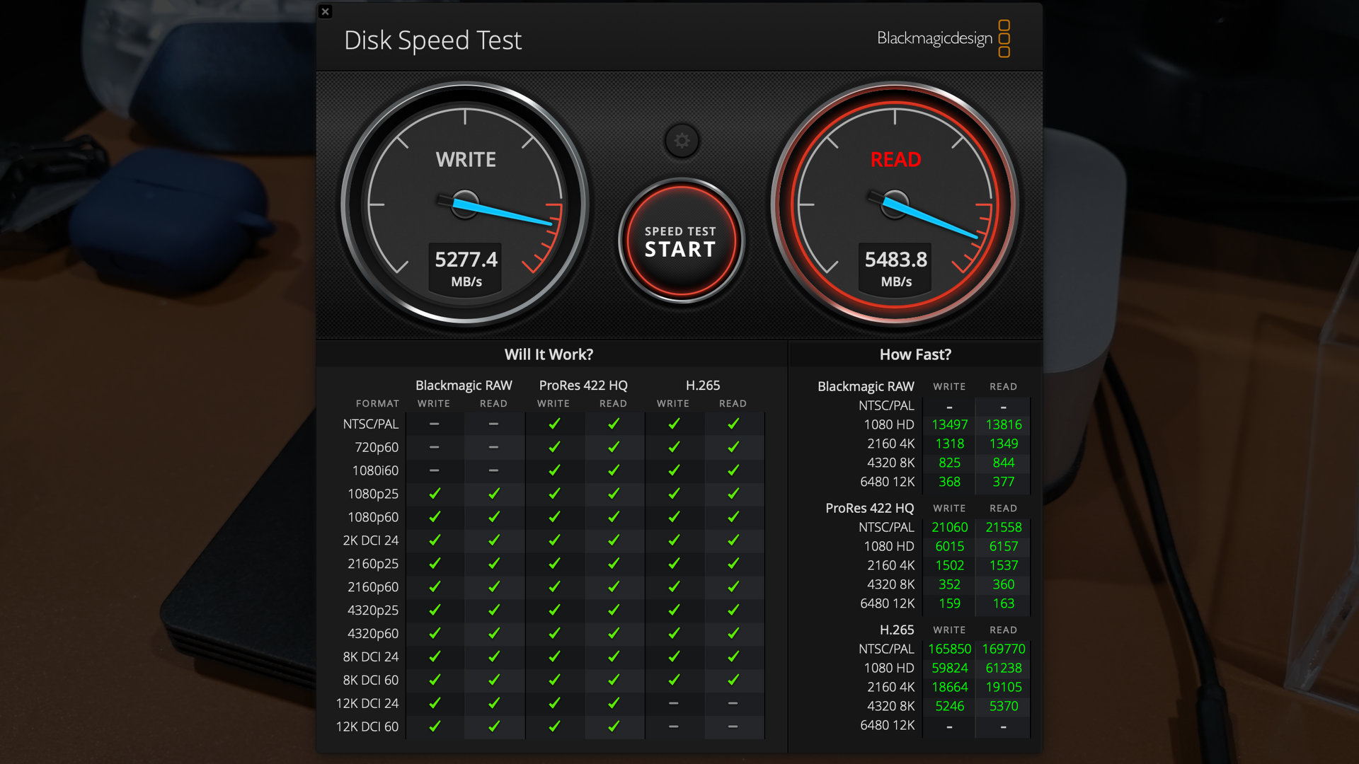 I also tried the famous Blackmagic Design Disk Speed Test and let it run for about 5 minutes non-stop, and the performance held up. We managed to get around 5.2GB/s write and 5.4GB/s read, and this OWC Envoy Ultra is basically fast enough to handle everything that we throw at it.