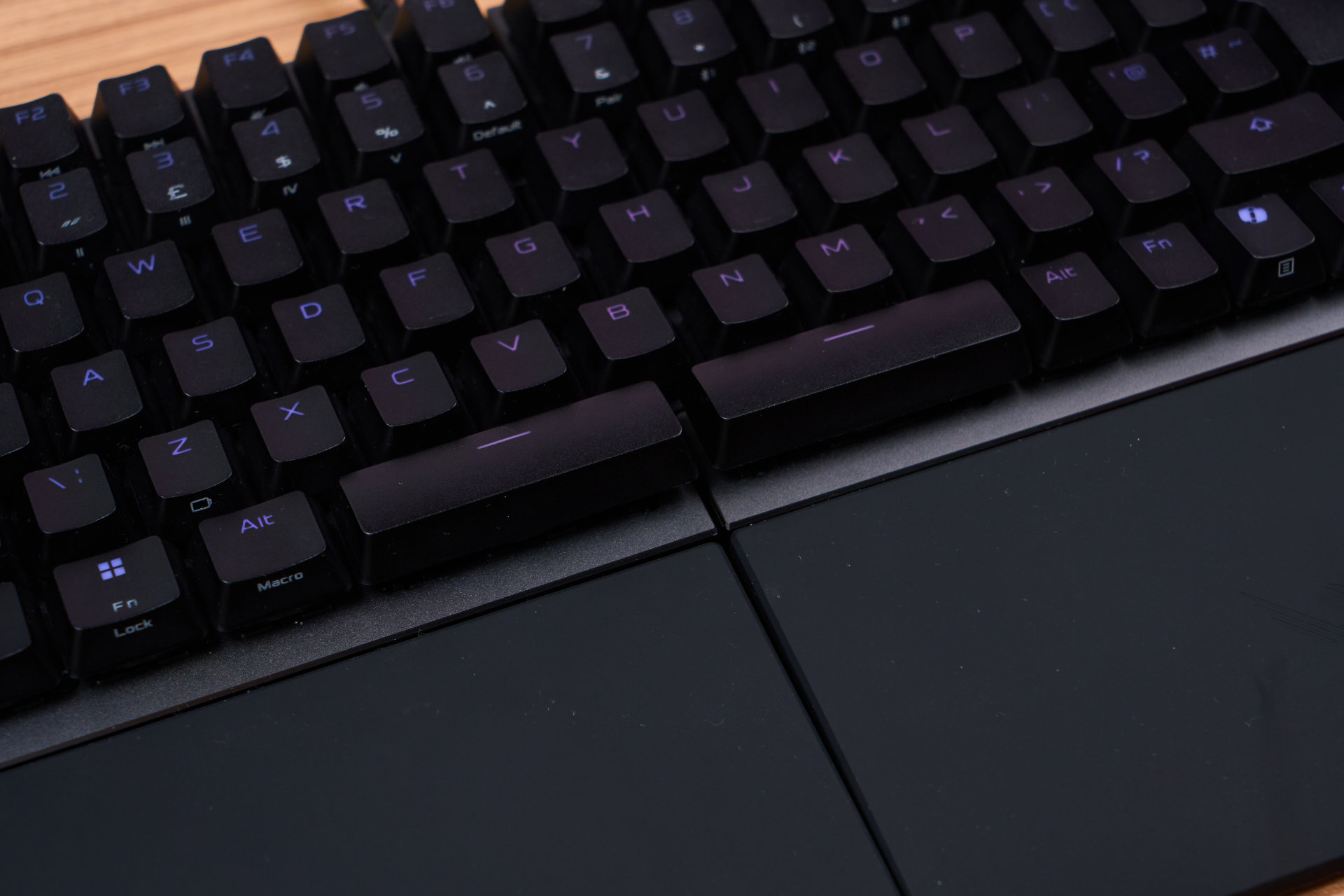 Now for the keyboard. To start, the layout here is interesting (Aside from the fact that this is an ISO model rather than ANSI, we use ANSI here) as it adopts the non-exploded 75% size for a more compact form factor, which matches its design philosophy of opening up more space on the right side so that the mouse has more pad estate to move around.