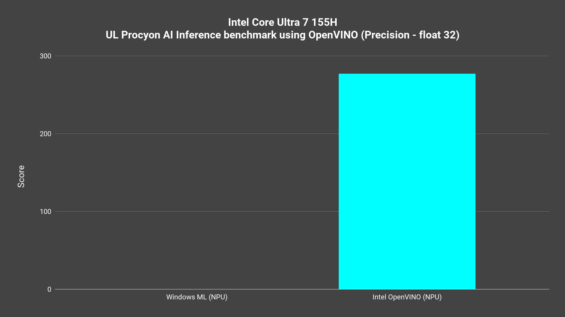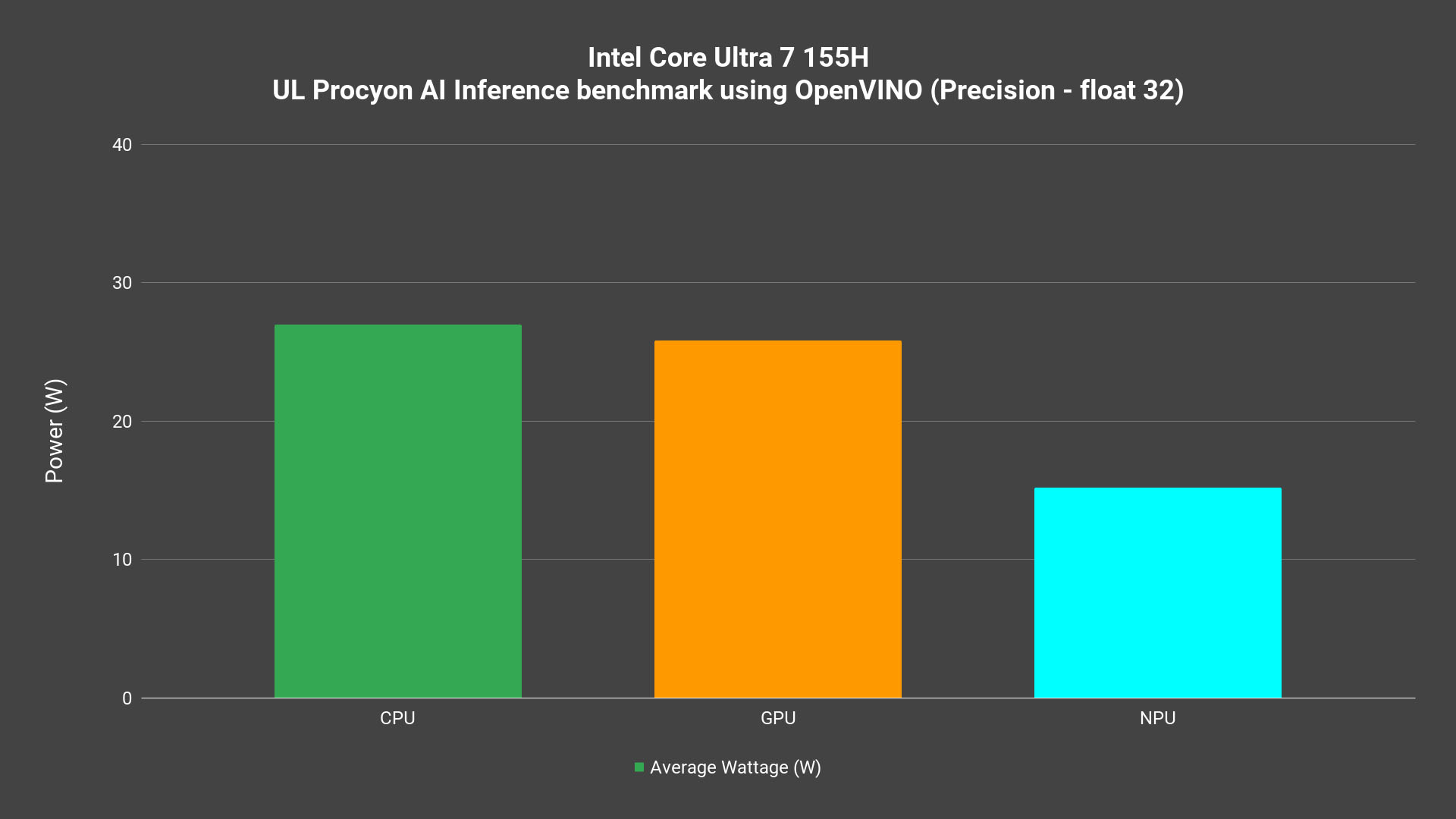 Okay, remember that the Meteor Lake SoCs have a built-in NPU? Yeah, unfortunately, we can’t use the NPU with Windows ML so we can’t compare the performance difference. As we can see here, the performance of the NPU is more than 4x better than the CPU using OpenVINO.